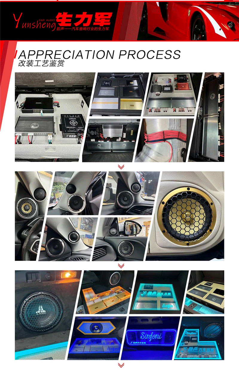 在使用隔音材料对门板做了隔音处理后,技师将前声场喇叭升级成了诗芬尼雅乐三分频,这套喇叭的中低音单元使用的是玻璃纤维音盆,周身环绕丁基橡胶悬边,让其具有很好的动态表现;中音使用的是特殊配方的音盆,让中频部分醇厚饱满,富有弹力;高音使用了倒丝圆顶设计,是的高频部分清晰通透。东莞汽车隔音